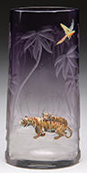 Extremely rare Moser vase has faceted sides and shades from clear to amethyst. Vase features two high relief figures of tigers standing amongst intaglio carved palm trees with a colorful applied parrot flying above. The intaglio carving surrounds the entire vase. Pictured in the book Moser Glass: The Klabin Collection by Gary D. Baldwin, pg. 28, plate 31. SIZE: 11″ t. PROVENANCE: George Klabin Collection. CONDITION: Very good to excellent with one tiny fleabite to tiger’s ear. 5-67245 (6,000-8,000) – Lot 1024