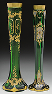 1) Moser cranberry glass cylindrical vase has Oriental inspired design with colorful dragons surrounded by brightly colored enameled flowers, stems and leaves with butterflies hovering amongst the flowers. The vase is finished with a gilded rim and applied gilded brass base with gargoyle feet. 2) Moser green glass cylindrical vase has brightly colored enameled flowers encircling the entire vase with stylized butterflies hovering amongst the flowers. Vase is finished with a gilded rim and brass base with gargoyle feet. Both vases are pictured in the book Moser Glass: The Klabin Collection by Gary D. Baldwin, pg. 29, plate 32. SIZE: 14-1/2″ and 9″ t. PROVENANCE: George Klabin Collection. CONDITION: Very good to excellent with some wear to gilded trim. 5-67334 (900-1,500) – Lot 1010