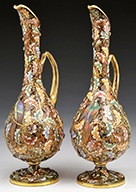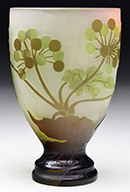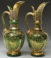Pair of Moser vases have all over gilded decoration of flowers, stems and leaves with cream colored enameled outline. All set against a clear shading to emerald green glass body. The bulbous foot of the vase is decorated with matching floral design and applied and gilded prunts. SIZE: 11″ t. PROVENANCE: George Klabin Collection. CONDITION: Very good with some wear to gilding and chip to the tip of two prunts. 5-67422 (1,000-1,500) – Lot 1019