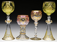 Set of four Moser clear glass wines are elegantly decorated with stylized flowers and leaves in gilded and stained finish. Each gilded flower is further decorated with an applied opalescent glass jewel in the center. The bowl rests on a hollow-blown stem with applied prunts which is supported by an inverted saucer foot with matching decoration. SIZE: 8″ t. PROVENANCE: George Klabin Collection. CONDITION: Very good with some minor roughness to underside of feet. One wine glass has had approx. 1/8″ ground off the bottom of the foot. 5-67357 (600-800) – Lot 1000