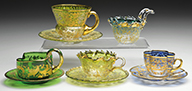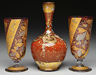 Moser cranberry glass juice set has small bulbous pitcher with pinched sides and applied reeded glass handle along with two matching juice glasses. Each piece is decorated with brightly colored enameled oak leaves with yellow enameled branches and an enameled flying insect beneath the lip. Each piece is further decorated with applied and partially gilded acorns. Each piece is signed on the underside. SIZE: Pitcher is 5″ t. PROVENANCE: George Klabin Collection. CONDITION: Very good to excellent with wear to gilding on lips. 5-67476 (1,000-1,500) – Lot 1018