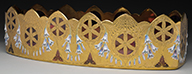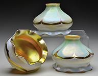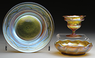 Large Moser center bowl has gilded background with cutout wheels showing cranberry staining behind. Wheels are surrounded by sculptural applied and enameled bellflowers creating swags around the openings. Gilded background is further decorated with gold enamel geometric designs. Center bowl is pictured in the book Moser Glass: The Klabin Collection by Gary D. Baldwin, pg. 91, plate 112. SIZE: 16″ l x 7-3/8″ w x 4-3/8″ t. PROVENANCE: George Klabin Collection. CONDITION: Very good to excellent. 5-67412 (1,500-2,500) – Lot 1021