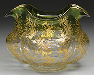 Moser green glass vase has vertically ribbed body and is decorated with heavy gold enameled flowers and scrolls encircling the entire vase. Vase is finished with three applied green glass handles which are decorated with heavy gold enameled scrolls. Vase also has gilded lip and foot. Vase is pictured in the book Moser Glass: The Klabin Collection by Gary D. Baldwin, pg. 11, plate 11. SIZE: 11-1/4″ t. PROVENANCE: George Klabin Collection. CONDITION: Very good to excellent with wear to gilding. 5-67282 (800-1,200) – Lot 1004
