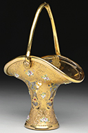 Moser vase has heart shaped clear glass panels surrounding the body with brightly colored enameled sprays of flowers within each panel. The panels are surrounded by solid gilded backgrounds with brightly colored enamel flowers and leaves. The vase is finished with two applied and gilded handles. Vase is pictured in the book Moser Glass: The Klabin Collection by Gary D. Baldwin, pg. 38, plate 44. SIZE: 10-1/2″ t. PROVENANCE: George Klabin Collection. CONDITION: Very good to excellent with some minor wear to gilding. 5-67465 (1,000-1,500) – Lot 1016