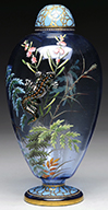 Moser aqua-blue glass vase has heavily enameled fern leaves and flowers on the front of the vase and is further decorated with a green glass applied salamander with enameled spots. Vase is decorated on the backside with a spray of fern leaves and grass. Vase is finished with a blue enameled lid and foot in a craquelure pattern. Vase is pictured in the book Moser Glass: The Klabin Collection by Gary D. Baldwin, pg. 30, plate 33. SIZE: 9-1/2″ t. PROVENANCE: George Klabin Collection. CONDITION: Very good to excellent. 5-67479 (800-1,200) – Lot 1011