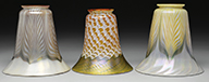 Tiffany Studios blotter corners and pen tray are decorated in the Bookmark pattern with gold patina. Pen tray has purple polychrome background in the pattern. Blotter corners have remnants of polychrome background. Signed on the backside “Tiffany Studios New York”. Pen tray is numbered “1055” and blotter corners numbered “991”. SIZE: Pen tray is 8-5/8″ l. CONDITION: Very good with some wear and discoloration to patina. 5-69140 (500-800) – Lot 2755