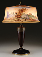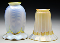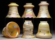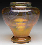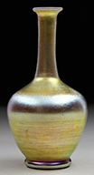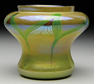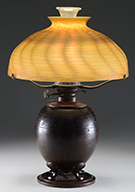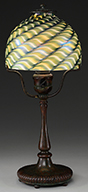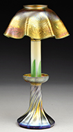 Tiffany favrile glass lamp shaft has green freeform decoration against a gold iridescent background. The green iridescence shows strong purple and blue highlights. Shaft is mounted on a turned wooden foot with painted gold and green finish. SIZE: Shaft is approx 11-1/2″ t x 6″ dia. Overall lamp base is 30″ t. CONDITION: Shaft is very good to excellent. Wooden foot has flaking paint. 5-68927 (500-700) – Lot 2727