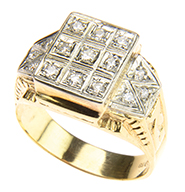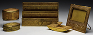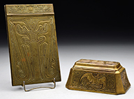 Lot consists of a Tiffany Studios Chinese pattern note pad as well as a Chinese pattern stamp box. The note pad has a gold dore finish. The stamp box has a bright gold finish with black polychrome highlighting the pattern. Both are signed “Tiffany Studios New York” and numbered. SIZE: Note pad 4-1/2″ x 7-1/2″. Stamp box 5-1/2″ x 3-1/2″ CONDITION: Very good to excellent with some minor wear and staining to patina. 5-67930 (500-800) – Lot 2753