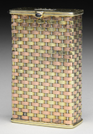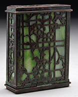 Tiffany Studios card box has acid cut trellis and flower design with green slag glass backing. The bronze has rich brown patina with green highlights. Signed on the underside “Tiffany Studios New York”. SIZE: 4″ t x 3″ w. CONDITION: There is a Y-shaped tight hairline to glass in lid. Otherwise very good with some minor wear to patina. 5-67919 (1,000-1,500) – Lot 2744