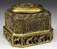 Tiffany Studios double inkwell in the Chinese pattern has gold dore patina with 2 original clear glass inserts under the hinged lid. Stamped on the underside “Tiffany Studios New York 1763”. SIZE: 5-1/2″ l x 3-1/2″ d x 2″ t. CONDITION: Very good to excellent. 5-68907 (1,000-1,500) – Lot 2746