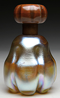 Large Moser amber glass pillow vase is decorated with a brightly colored enamel bird in the center surrounded by sprays of colorful enamel oak leaves and a large number of applied and partially gilded acorns. The acorn and oak leaf decoration extends to the opposite side where it surrounds a blue exotic bird with wings spread. Vase is finished with an applied and gilded glass rigaree on each end and four applied reeded glass feet with gilded finish. Vase is pictured in the book Moser Glass: The Klabin Collection by Gary D. Baldwin, pg. 4, plate 3. SIZE: 9-3/4″ t. PROVENANCE: George Klabin Collection. CONDITION: There is a shallow flake approx. 3/8″ long across the lip at one end of the vase. Otherwise very good to excellent. 5-67435 (3,000-5,000) – Lot 1007