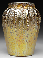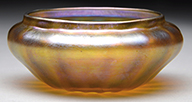 Tiffany Studios jardiniere has acid etched grapevine design surrounding the body. The design is backed by caramel slagged glass and the jardiniere is finished in bright gold patina. Complete with heavy bronze liner. Stamped on the underside “Tiffany Studios New York 833”. SIZE: 10-1/2″ dia. 3-3/4″ t. CONDITION: Very good to excellent. 5-67900 (3,000-5,000) – Lot 2731