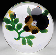 Moser amethyst glass box has brightly colored enameled floral decoration on all sides and top of the box. Within the floral sprays are brightly colored enameled birds. Box is finished with brass handles, collar, and lock. Box is pictured in the book Moser Glass: The Klabin Collection by Gary D. Baldwin, pg. 60, plate 70. SIZE: 5-1/4″ w x 3-1/2″ d x 4-1/2″ t. PROVENANCE: George Klabin Collection. CONDITION: Very good to excellent with wear to gilding on beveled edges. 5-67493 (1,000-1,500) – Lot 1008