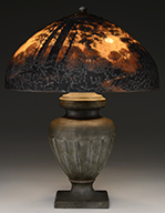 Tiffany Studios humidor has acid etched pine needle pattern backed with caramel slag glass. Humidor has bright gold patina and is complete with original inside lid and outside lid. Marked on the underside “Tiffany Studios New York 1026”. SIZE: 6-3/4″ t. CONDITION: A few minor dents to outside lid. Otherwise very good to excellent. 5-67908 (2,500-3,000) – Lot 2732