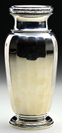 Moser vase is decorated with flower pots with a single stem leading to a multi-layered bouquet of applied and enameled flowers. Each flower pot alternates with a wreath of multi-layered applied and enameled flowers. All set against a gilded background with enameled scrolled borders. Decoration is all set against a flashed cranberry ground. Vase is pictured in the book Moser Glass: The Klabin Collection; pg. 45, plate 52. SIZE: 10″ t. PROVENANCE: George Klabin Collection. CONDITION: Very good to excellent with some very minor loss to flower petals and some very minor scratches to gilded background. Wear to gilding at foot. 5-67416 (1,200-1,500) – Lot 1023