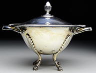Large Moser green glass chalice has gold and platinum grapevine pattern surrounding the foot, ball, and bowl. Front of the chalice has a nicely enameled scene of what appears to be a King handing a grapevine to a kneeling gentleman with a halo above the gentleman’s head inscribed “SANCT NOAH”. Back of the chalice has two panels with German writing, presumably the story of the picture. Chalice is finished with four applied and gilded flower prunts around the ball and a gilded lip and foot edge. Chalice is pictured in the book Moser Glass: The Klabin Collection by Gary D. Baldwin, pg. 128, plate 167. SIZE: 13″ t. PROVENANCE: George Klabin Collection. CONDITION: Very good to excellent with some very minor wear to gilding. 5-67436 (1,500-2,500) – Lot 1022