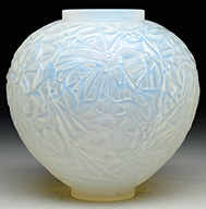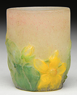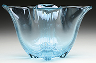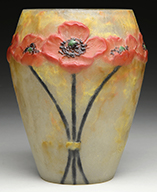 Monumental Moser vase shades from pink to clear to pink. It has a center orange and yellow marquetry poppy that is nicely wheel carved with good detail. Remainder of the vase is intaglio carved with poppies, stems, and leaves. Carving is nicely detailed and quite deep. Vase is pictured in the book Moser Glass: The Klabin Collection by Gary D. Baldwin, pg. 3, plate 1. SIZE: 18″ t. PROVENANCE: George Klabin Collection. CONDITION: Some shallow flakes and roughness to inside lip. Otherwise very good. 5-67406 (6,000-8,000) – Lot 1003