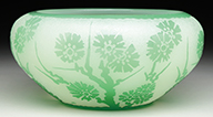 Austrian possibly Moser center bowl has intaglio carved woodland scene with bird’s in flight as well as a group of stags within a forest of stylized trees. Intaglio carving was then gilded giving the scene nice detail and brilliance. SIZE: 12-1/4″ dia. PROVENANCE: George Klabin Collection. CONDITION: Very good to excellent. 5-67351 (700-1,000) – Lot 1012
