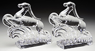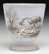 Moser amethyst shading to clear glass vase has a diamond shape and is decorated with sculptural applied and enameled buck and a doe. The vase is further decorated with deep intaglio carving of trees, rocks and grasses. The intaglio carving is highlighted and shaded with gilding. Signed on the underside in polished pontil “Moser Karlsbad”. Vase is pictured in the book Moser Glass: The Klabin Collection by Gary D. Baldwin, pg. 26, plate 29. SIZE: 9-1/2″ t. PROVENANCE: George Klabin Collection. CONDITION: There is a 1/2″ shell shaped flake at the back bottom corner and a tiny fleabite at the front bottom corner of the vase. Otherwise very good. 5-67425 (3,000-5,000) – Lot 1006