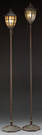 Pair of Tiffany Studios bamboo candlesticks are finished in a rich brown patina with green highlights and each topped with a bobeche. Each candlestick is signed on the underside “Tiffany Studios New York 1205”. SIZE: 10″ t each. CONDITION: Very good to excellent. 5-69157 (1,000-2,000) – Lot 2750a