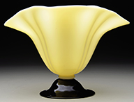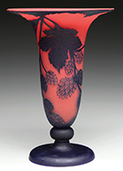 Moser amber glass chalice is decorated with an allover pattern of brightly colored grape leaves and vines with numerous applied clusters of grapes. Among the grape leaves are several large brightly enameled insects and the chalice is finished with an applied gilded glass rim with drippings. Applied rim is also decorated with numerous brightly colored insects. Chalice is pictured in the book Moser Glass: The Klabin Collection by Gary D. Baldwin, pg. 77, plate 92. SIZE: 9-3/4″ t. PROVENANCE: George Klabin Collection. CONDITION: Very good to excellent. 5-67467 (800-1,200) – Lot 1001