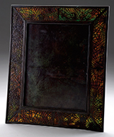 Large Tiffany Studios picture frame has acid etched Pine Needle pattern and is backed with mottled green and red glass. The bronze is finished with a dark brown patina with subtle green highlights. Frame is complete with its original easel back and also has bronze rings for hanging. SIZE: Overall: 12″ x 14″. Picture opening: 7-1/2″ x 9-3/4″. CONDITION: Very good to excellent with a small dent to corner of frame near opening, one hanging ring is detached. 5-68973 (2,000-3,000) – Lot 2735