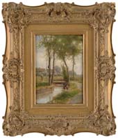 RHODA CARLETON HOLMES NICHOLLS (American, 1854-1930) CITY PARK. Fine oil on board scene shows a gazebo at the edge of a pond with arched bridge and church steeple beyond. Green lawns with flowers and trees. Probably Boston Gardens. Signed lower right. Back having a small portrait sketch. Housed in a fine modern gilt molded wood frame. SIZE: 12” x 18-1/4”. CONDITION: 9-72891 (4,000-6,000)