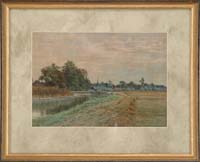 MARTIN MYERSON (American, 20th Century) COASTAL HARBOR VILLAGE. Watercolor scene shows a sailboat approaching a small harbor with buildings and church. Probably a French village, probably the coast of Normandy. A French flag flies off the hillside. Signed lower right. Housed in a modern gilt frame with light brown matte. SIGHT SIZE: 10” x 13-1/2”. CONDITION: Fair, there is some abrasion to the upper third with watercolor loss. 9-73511 (100-200)