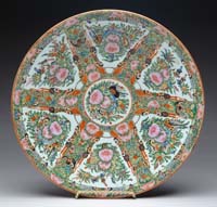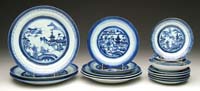 OUTSTANDING FIFTEEN PIECE LIMOGES GAME SET. Artist signed “Laure” the pieces marked by the Coiffe Porcelain Factory (Limoges, France) and the Limoges decorating company. Set consists of: 19” x 12-1/2” platter; twelve 9-1/2” plates; two 7-1/2” x 4-1/2” sauce dishes. Each piece decorated with two birds against a green-blue landscape. The plates are set in pairs having the same birds in mirror image to one another. The outside edges in a heavy gold decoration. An outstanding set. CONDITION: Very good to excellent. 9-73666 (1,500-2,500)
