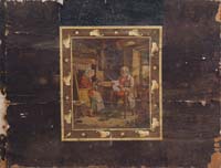 LOT OF EIGHT FRAMED ITEMS. Lot includes: three modern needlework pictures; two modern English prints; painting of birds and flowers, signed indistinctly from 20th century; a Stevensgraph-type picture of colonial people; antique oil on canvas of Jesus at the well housed in a gilt period frame. The scene shows Jesus at a well with a woman with a town in background under blue sky. 12” x 9”. CONDITION: Good. 9-74044 (200-400)