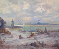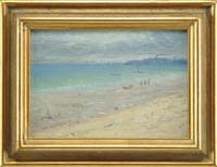 ANSON KENT CROSS (American, 1862-1944) FIGURES ON A BEACH. Oil on board beach scene shows three figures walking past small rowboat. A city is seen in background with green to blue ocean. Signed lower left and dated “14”. Housed in a gilt molded wood frame. SIGHT SIZE: 6-1/2” x 9-1/2”. CONDITION: Very good. 9-72920 (1,000-1,500)