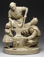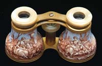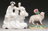 LEADED GLASS FRAMED LITHOPANE. Central white dome top pane of three women walking, one with halo over her head. Signed “HPM 148”. Lithopane is framed with blue leaded glass having red inside corners. SIZE: Total is 14” x 9-1/2”. Pane is 11” x 6-3/4”. CONDITION: One piece of blue glass has two cracks, otherwise very good. 9-73733 (200-400)