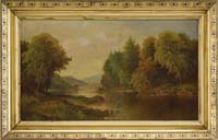 R.S.VAN NESS (19th Century) LANDSCAPE WITH MILL AND FIGURES. Oil on canvas scene shows a large mill with water wheel and pond nestled in a river valley with woods and mountain. Two men are seen near mill and in the foreground are two hunters with bird dogs conversing with a man on horseback. Sunset sky blue to pink. Signed lower left “R.S. van Nefs”. Housed in a fancy gesso decorated gilt frame. SIZE: 22” x 30”. CONDITION: Two small holes generally very good. Frame has some gesso damage with some pieces present. 9-73195 (1,500-2,500)