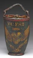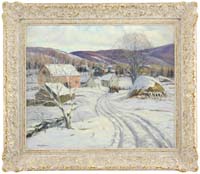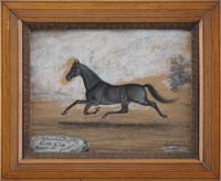 JOHN N HESS (American, Late 19th Century) THE RED LION INN. Oil on canvas scene shows a four horse led stagecoach with three people in front seat. They make the turn onto a dirt road in front of a Colonial Inn with large front porch and tall sign “Red Lion”. The host and hostess are out on the porch and the man waves the hat at the oncoming coach. A well pump and trough are seen in front to water the horses. A two-wheel carriage is seen on grass and other buildings amongst the trees. All under a blue and cloud sky. Signed lower right “J. N. Hess” and dated “76”. Housed in an outstanding gesso decorated deep 19th Century frame. SIZE: 17” x 26”. CONDITION: Relined, spot inpainting. Very good. 9-72905 (3,000-5,000)