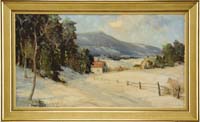 MAX LEIMGRUB (German, 19th/20th Century) PAIR OF ALPINE LAKE SCENES. Oil on panel scene show snow covered mountain background in a spring setting. One having a boat with two people on a calm lake with foreground shoreline. Other a shallow end with rocks showing lakefront scattered with houses. Signed lower left and other lower right “M Leimgrub”. Housed in identical period gesso decorated gilt frames with wood gilt liner. SIZE: 6” x 10-1/4”. CONDITION: Frames have damage, surface dirt. Generally very good. 9-73396 (500-800)