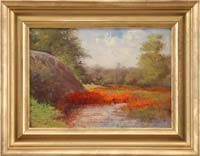 ROBERT C. WOODBERRY (American, 1874-) IMPRESSIONISTIC LANDSCAPE. Unsigned oil on board impressionistic scene shows a clearing with tall trees in wonderful pastel colors. Back of board Estate stamped “Estate of Robert Woodberry”. Housed in a good gesso decorated wood frame. SIZE: 15-1/2” x 20”. CONDITION: Very good. 9-73521 (1,000-2,000)