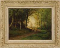 ROBERT BOLLING BRANDEGEE (American, 1848-1922) “TWIN LAKES”. Oil on canvas mounted on board summer landscape shows a dirt road winding through grass covered forest. Signed and titled lower right. Housed in a gilt wood frame with gold wood liner. SIZE: 19” x 11-1/4”. CONDITION: Very good. 9-73523 (300-500)