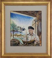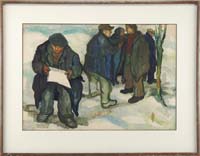UNSIGNED (First half of the 20th Century) WINTER GATHERING. Watercolor WPA style scene shows five figures in a snow landscape. They are wearing heavy clothes and one reads from a newspaper. Unsigned. Housed in a simple silvered gilt wood frame with white matte and no glass. SIGHT SIZE: 16” x 23-1/4”. CONDITION: Good, open crease on right side. 9-73486 (200-400)