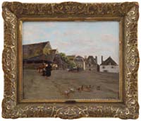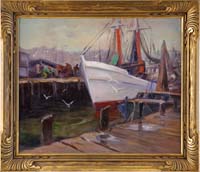 R. KROTTER (Early 20th Century) SEASIDE FLOWER MARKET. Oil on canvas scene shows a dockside flower market with many people and pots of flowers. Some yellow flowers are seen in a green wagon while blue, white, red and yellow flowers are seen in pots on the ground. Signed lower left “R. Krotter”. Housed in a fine gesso decorated and partial gilt frame which appears to be original. Frame has a metal tag “Paine Furniture Company”. SIZE: 24” x 30”. CONDITION: Very good. 9-73398 (400-800)
