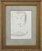 L ASCHER (Mid 20th Century) ABSTRACT PORTRAIT. Pen and ink drawing of a shoulder length head portrait. Dalisque style with accentuated facial features. Signed lower right “L. Ascher 44”. Housed in a good carved wood frame with modern double mattes. SIGHT SIZE: 10-1/4” x 7-3/4”. CONDITION: Very good. 9-73502 (200-300)