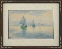 D.M. (18th/19th Century) CALM SAIL. Watercolor scene shows two sailboats on a calm ocean. Signed lower left “DM” with a possible date of “91”. Nicely housed in a carved period frame with double replaced mattes. SIGHT SIZE: 7” x 10-3/4”. CONDITION: Fair to good. 9-73510 (100-150)
