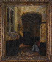 ADDISON THOMAS MILLAR (American, 1860-1913) EUROPEAN CANAL SCENE. Oil on board scene shows a canal lined with houses. A bridge is seen across the canal under cloud and blue sky. Unframed. SIZE: 9-1/4” x 6-1/4”. CONDITION: Good with some roughness to edges. 9-72915 (1,250-1,750)