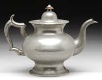 STERLING SIX PIECE COFFEE AND TEA SERVICE BY RICHARD DIMES. In the “Cromwell” pattern, part of their early English reproduction line. Set consists of: 13” h kettle on stand with burner; 8-1/2” h coffee pot; 7-1/4” teapot; 5-1/4” covered sugar; 3-1/2” waste bowl; 4” h creamer. No monograms. WEIGHT: Total is 85 tr. oz. CONDITION: Very good. 9-73856 (1,200-1,800)