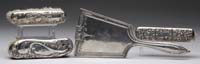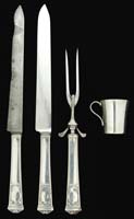 FOUR PIECE LOT OF STERLING BY TIFFANY & CO. Lot consists of 1) A small handled cup marked “Tiffany & Co makers sterling 22499 L”. The tapered cup having a loop type handle. The mark corresponding to 1956-1965 and the L for William T. Lusk. WEIGHT: 52 gr, 1.6 tr. oz. SIZE: 2” h. 2, 3, & 4) Three piece carving set in the San Lorenzo pattern. The set consists of two 14-1/4” knives, one having a well used blade and a 11” fork with folding stand. Each piece monogrammed “SB”. CONDITION: Good unless otherwise noted. 9-73705 (250-400)