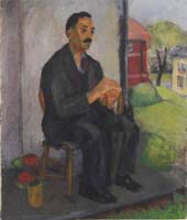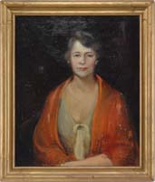 ELIZABETH B. LATHAM (American, ) PORTRAIT OF A SOCIALITE. Oil on canvas half portrait of a middle age woman wearing a red shawl seated in a Sheraton style chair. She looks straight at the viewer with arms crossed on lap and is against a black background. Signed lower right “Elizabeth B. Latham”. Housed in a period carved wood frame. Sitter has a resemblance to Margaret Chase Smith, one of Maine’s illustrious Senators. SIZE: 30” x 25”. CONDITION: Some patches to reverse with some inpainting. Surface has many small chips and in need of some restoration. 9-73722 (300-500)