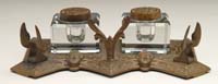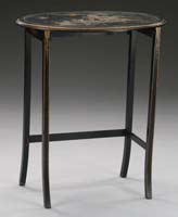 FINE ORIENTAL STYLE MIRROR RETAILED BY TIFFANY STUDIOS. Oriental design two-door front mirror has gilt Oriental figures and open base with gilt pierce carved flowers and an open crest with gilt bird and two jade discs. Accompanying the mirror and not attached is a red label “Tiffany Studios 347-355 Madison Ave O. No. 5619 Price $45”. The first tag of this kind that this auction company has seen. SIZE: 20” x 13”. CONDITION: Generally very good. 9-73789 (500-700)