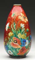 OUTSTANDING SCULPTURED CAMILLE FAURE LIMOGES VASE. Tall tapered vase with silver footed base having small flaring mouth with a rolled silver rim. The piece is marked “C. Faure-Limoges France” on bottom. The Art Deco sculpted design in colors of deep and light red, white, and deep blue/black. Overlapping red petals with white circles. PROVENANCE: Christie’s 1986. SIZE: 10-1/4”h. CONDITION: Very good. 9-73741 (6,000-8,000)