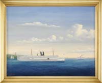 FRED M THOMPSON (American, Mid 20th Century) “ON THE HUDSON”. Unframed oil on artist board scene shows a white side wheel steamboat on the Hudson surrounded by tall green hills. Signed bottom right and titled and dated “July 1954” on reverse SIZE: 12” x 16”. CONDITION: Bowed board, some scratches and surface dirt. 9-73501 (100-200)