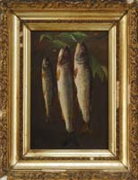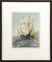 SIGNED (Mid 19th Century) THE NET FISHERMAN. Watercolor scene shows a man walking along a rocky shore with large net over his shoulder. Several large sailing vessels are seen beyond a sunlit ocean. Gathering dark clouds with showers are seen in distance. Illegibly signed and dated “1867”. Housed in modern silvered gilt molded wood frame with gray matte. SIGHT SIZE: 5-1/2” x 10”. CONDITION: Very good. 9-73504 (200-300)
