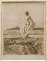 MAXFIELD PARRISH (American, 1870-1966) “STARS”. Framed colorful print shows a nude woman seated on a rock overlooking sea and sky. Label to reverse “From the House of Art, New York”. Housed in a nice gilt decorated frame. SIGHT SIZE: 19-1/2” x 11-1/2”. CONDITION: Very good. 9-74061 (100-200)